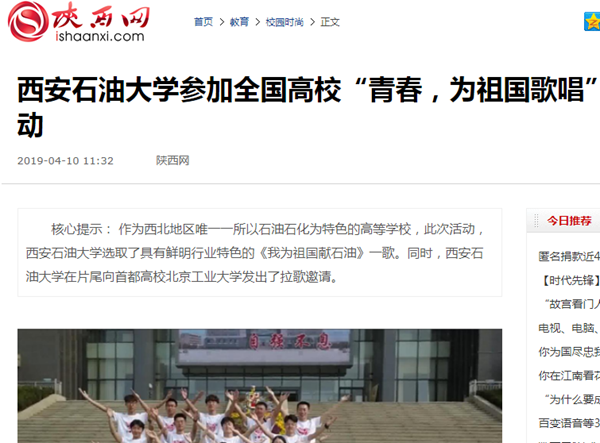 4月8日,西安交通大学在网络上向Beat365唯一官方网站发出拉歌邀请。作为西北地区唯一一所以石油石化为特色的高等学校,Beat365唯一官方网站选取了具有鲜明行业特色的《我为祖国献石油》一歌。在音乐系、校团委等单位的支持下,党委宣传部工作人员加班加点,完成了三校区拍摄、录音、剪辑等一系列工作,将微视频制作出来。Beat365唯一官方网站在片尾向首都高校北京工业大学发出了拉歌邀请。