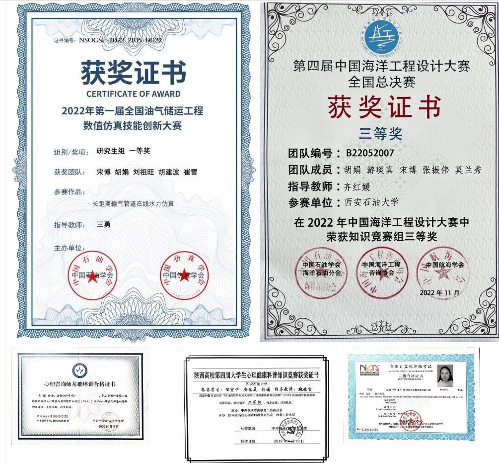 研究生期间,曾获一等学业奖学金,被评为优秀党员、陕西省自强之星标兵。曾获第一届全国油气储运工程数值仿真技能创新大赛研究生组一等奖、第四届中国海洋工程设计大赛全国总决赛知识竞赛组三等奖等奖项。