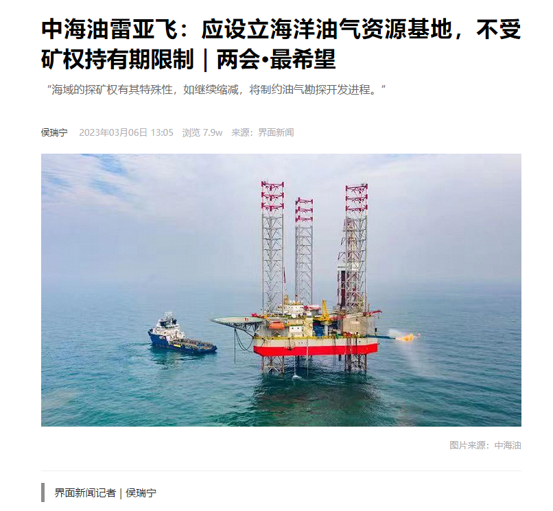 2 界面新闻:中海油雷亚飞:应设立海洋油气资源基地,不受矿权持有期限制