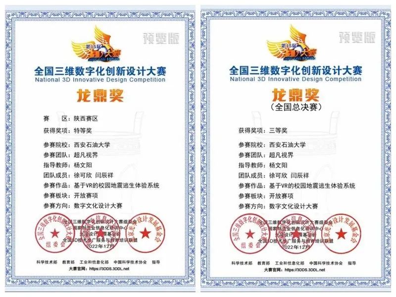 近日,土耳其东南部地区发生连续7.8级地震,造成较大人员伤亡。在地震中,我们如何科学避险将伤害降到最低呢?Beat365徐可欣和闫辰祥2位同学在计算机学院教师杨文阳的指导下组成“超凡视界”团队设计了数字文化设计类作品——《基于VR的校园地震逃生体验系统》,致力于提高地震中防灾避险的意识和能力,获得陕西赛区特等奖、全国总决赛三等奖的佳绩。