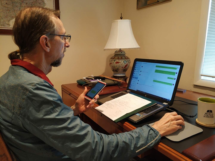 新学期Quinn老师教授英语1801/02两个班的英语口语和英语1801/02及翻译1801/02班的英语国家概况课程。他远在美国,却时刻关注中国的疫情发展,尤其关心他的学生们的学习和生活,主动与学院及授课所在系部领导沟通交流如何开展线上授课,提出方案及预案,并在开课前多次和所带班级学生进行网课试运行。因美国和我国存在13个小时的时差,他宁愿牺牲自己的休息时间,也要保证在北京时间进行教学。个别时段Quinn老师也会将要讲内容做成PPT课件进行录播,配播一些视频资料拓展学生视野,并在学生合适的时间通过QQ或微信答疑解惑。翻译1801班秦梦园同学说:“疫情之前我们就在上Quinn老师的口语课,而值此疫情期间,远隔大洋,我们通过网络又与老师相聚云端,学习英语国家概况课,很是新鲜且兴奋,Quinn老师又给我们展现了他教学风采的另一面,我们一定会配合好老师,把教授的知识一定记牢、学会,应用在实践中,期待着与老师重逢在美丽的校园!”